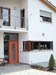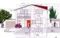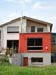 Die Fassade spielt mit weissen und roten Putzflächen, sowie