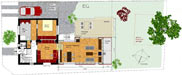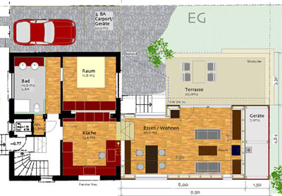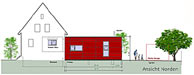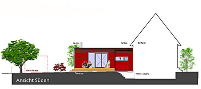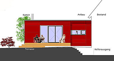 Projekt 2008Die Örtlichkeit zeichnet sich durch einen freistehenden Bau der 30er Jahren aus, welcher seinen Zugang zum Garten nur über den Keller hat. Die Raumaufteilung war nicht mehr zeitgemäß und der Platzbedarf nicht ausreichend. Zielsetzung des Projektes war die energetische Sanierung und Neuorganisation der Erdgeschoss- und Wohnebene mit Zugang zum Garten. Das EG erhielt einen Durchbruch zum Neubauteil, der Küche mit dem neuen Ess- und Wohnbereich verbindet. Auf der Gartenseite wird eine großzügige Holz-Terrasse mit direkter Treppe in den Garten angebaut. Der Anbau ist als Holzbau konzipiert, was einen Ausbau in Eigenleistung erleichtert und ist mit roten Fassaden-Tafeln bekleidet. Die Küche wurde verlegt. Die Aussenwand erhält zum neuen Ess- und Wohnbereich einen großen Durchbruch, der sich über 4 Stufen nach unten zum Neubau öffnet. Der Anbau schwebt leicht über dem Boden, sodass man ebenerdig zur Terrasse austreten kann. Die Terrasse hat eine bis zwei vorgelagerte Sitzstufen bis zum Gartenniveau. Ein Bad in der ehem. Küche, wäre als 2. BA denkbar und würde das neue Elternzimmer sinnvoll ergänzen. Der Abstellraum könnte zum Flur geöffnet werden und somit als Kammer für die neue Küche dienen, die im Bereich des alten Durchganges Einbauschränke mit reichlich Stauraum erhält. Der Neubau sieht zum Garten einen Geräteteil für Werkzeuge vor, der Carport könnte später noch als 3. BA umgesetzt werden.