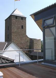 Stadtmauer. Die geringe Breite 6,40m und hohe Bautiefe 11,0m,