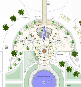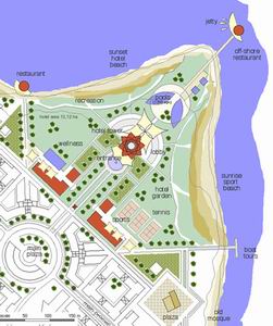 Es wurde ein `masterplan´ erarbeitet, der 5 Bereiche umfasste. Der Hotelbereich auf 13 Hektar Fläche, ein eigens angeschütteter Yacht-Hafen mit Wohnbebauung, eine Clubdorf-Anlage, verschiedene Einkaufspromenaden und den größten Bereich bildete die `falling water golf club´ Anlage.