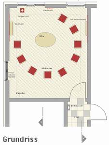 Der Vorschlag im Kreis gemeinsam um einen ovalen Altar zu sitzen gefiel ihm sehr gut, ebenso wie das Glasbild mit einem abstrahierten Petrus Canisius.