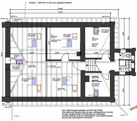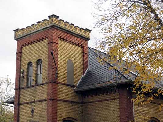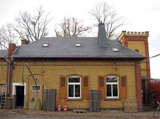 Das ehemalige Wasserwerk wird derzeit von der Stadt als Betriebshof genutzt. Größere Undichtigkeiten der bisherigen Bitumendachschindeln machten eine Sanierung der gesamten Daches unumgänglich. Um dem denkmalwürdigen Gebäude Rechnung zu tragen, wurde das Dach des alten Wasserwerkes mit Schiefer in Schuppendeckung neu gedeckt. Die Schalung konnte behalten werden, darüber wurde eine DWD Systemplatte mit Mindestdämmung verlegt, um den Lagerbereich frostfrei zu halten. Zur Belichtung wurden einzelne Dachflächenfenster eingebaut. Durch die Sanierung des Daches mit Schiefer wurde dem Gebäude seine ursprüngliche Gestalt wiedergegeben.