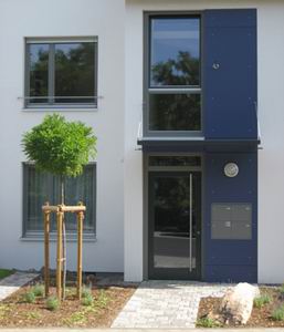 setzt. Die Steilgaube symbolisiert den Blick zum anderen Ufer. Das Haus bietet Familien 67-90 m2 mit bis zu 3 Zimmern; große Terrassen oder einem Balkon. Das EG ist schwellenfrei ausgeführt. Das Konzept ermöglicht einen rückwärtig autofreien Grünbereich. Ein weiterer Schwerpunkt war der Niedrigener-