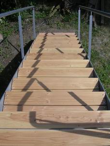 großzügige Stahl-Terrasse mit direkter Treppe in den Garten
