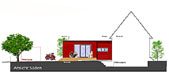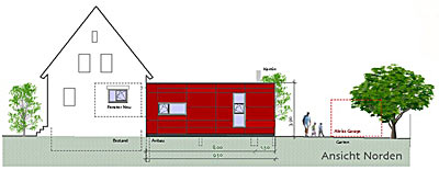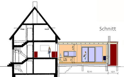 Projekt 2008Die Örtlichkeit zeichnet sich durch einen freistehenden Bau der 30er Jahren aus, welcher seinen Zugang zum Garten nur über den Keller hat. Die Raumaufteilung war nicht mehr zeitgemäß und der Platzbedarf nicht ausreichend. Zielsetzung des Projektes war die energetische Sanierung und Neuorganisation der Erdgeschoss- und Wohnebene mit Zugang zum Garten. Das EG erhielt einen Durchbruch zum Neubauteil, der Küche mit dem neuen Ess- und Wohnbereich verbindet. Auf der Gartenseite wird eine großzügige Holz-Terrasse mit direkter Treppe in den Garten angebaut. Der Anbau ist als Holzbau konzipiert, was einen Ausbau in Eigenleistung erleichtert und ist mit roten Fassaden-Tafeln bekleidet. Die Küche wurde verlegt. Die Aussenwand erhält zum neuen Ess- und Wohnbereich einen großen Durchbruch, der sich über 4 Stufen nach unten zum Neubau öffnet. Der Anbau schwebt leicht über dem Boden, sodass man ebenerdig zur Terrasse austreten kann. Die Terrasse hat eine bis zwei vorgelagerte Sitzstufen bis zum Gartenniveau. Ein Bad in der ehem. Küche, wäre als 2. BA denkbar und würde das neue Elternzimmer sinnvoll ergänzen. Der Abstellraum könnte zum Flur geöffnet werden und somit als Kammer für die neue Küche dienen, die im Bereich des alten Durchganges Einbauschränke mit reichlich Stauraum erhält. Der Neubau sieht zum Garten einen Geräteteil für Werkzeuge vor, der Carport könnte später noch als 3. BA umgesetzt werden.